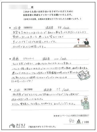 - U様より「最初は最寄りのキレイな店構えで入店しました。社員の皆様がとても感じが良く、初日に家もよく見てもらい、信頼できる会社だと思いました。細かい所まで施工内容を相談、提案してもらい、納得できる仕上りになりました。笑いの場と真剣な場でキチンと対応してもらいました。とてもキレイにリノベーションしてもらい、ありがとうございます」 と嬉しいコメントをいただきました。