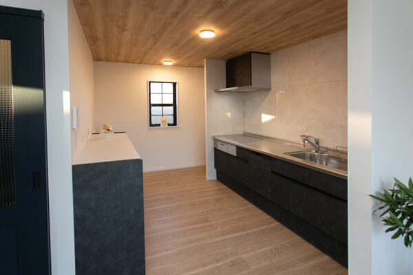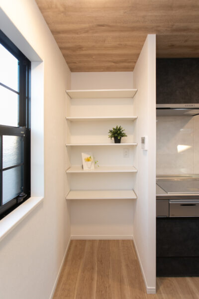 また、キッチンの背面(写真左手)にはカウンター収納を設置。