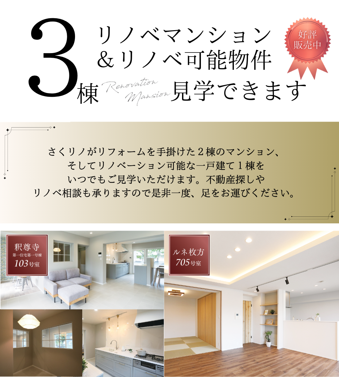 大阪府枚方市・交野市のリフォームなら さくらリフォーム > イベント情報 > 完成見学会 > リノベマンション&リノベ可能マンション全3棟見学会【枚方市・交野市】