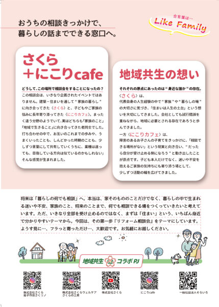 起業・住まいを通して「家族の暮らし」に向き合ってきた(さくら)と、子どもや家族の悩みに長年寄り添ってきた(にこりカフェ)。