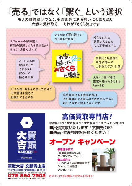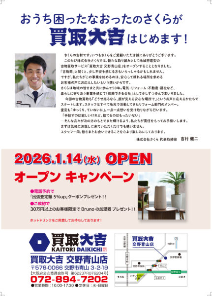 このたび株式会社さくらでは、新たな取り組みとして地域密着型古物買取サービス「買取大吉 交野青山店」をオープンすることとなりました。