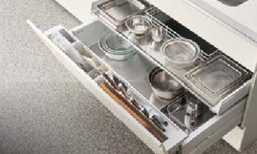 ステンレス底板使用調理道具がらくにパっと取りだせる収納。 シンク下、コンロ下の2か所にシェルフ付で搭載 -
