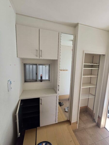 大人テイストな収納スペース♬ 2025年10月19日 現場中継ブログ 寝屋川市U様邸 全面リノベーション工事中の様子です。 玄関横の、元の収納スペースがこちら。 収納には少しスペースが足りない感じがします。 【工事前】 【工事中】 モノトーン調の落ち着いたクロスをお選びいただきました。 今月の末頃に、リノベーション工事が完了予定です。 仕上がりが楽しみです!