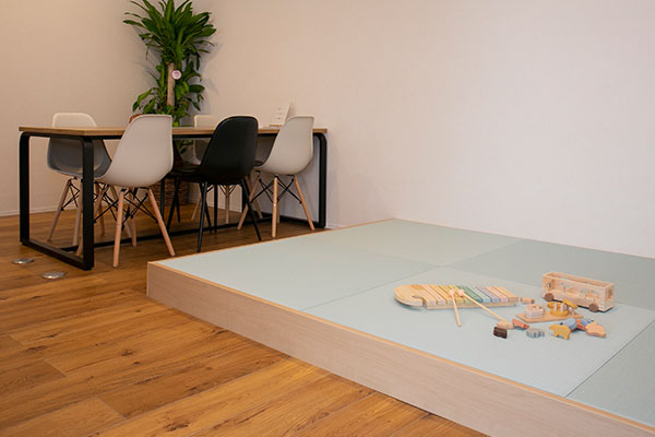 お子様も楽しく過ごせる畳のキッズスペースを完備し、ごゆっくりご相談いただけます。 -