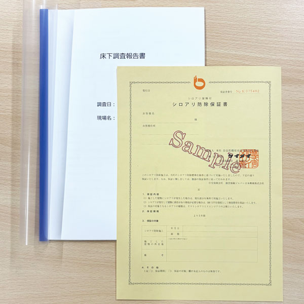 使用薬剤:人やペット、環境に優しい「社団法人日本シロアリ対策協会」認定薬剤のみを使用。