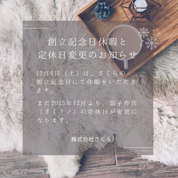 創立記念日休暇と茄子作店(さくリノ)定休日変更のお知らせ 2025年12月05日 お知らせ • スタッフまるちゃんのつぶやき 12月6日(土)は、さくらの創立記念日にて休暇をいただきます。 また、2025年12月より、茄子作店(さくリノ)の定休日が変更になりました。 ◆茄子作店(さくリノ)定休日◆ 【変更前】毎週水曜日、第2月曜日、第4日曜日 【変更後】毎週水曜日、日曜日、祝日、第2月曜日 ※星田本店と同じ定休日となります。 … 詳細はこちら