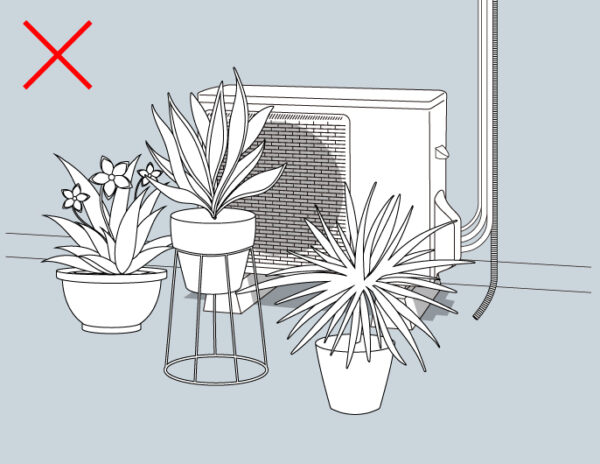 室外機の周囲が植物や植木鉢などでふさがれていませんか?風を通すための十分なスペースが確保できない場合は、冷房能力が10%程度悪化するおそれがあります。室外機の周囲に、十分なスペースを空けてください。